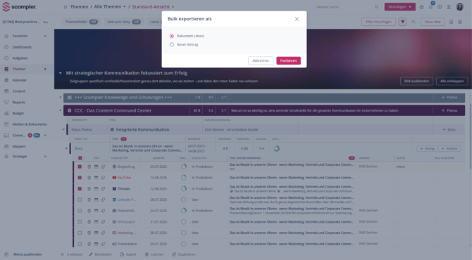 Um die Beiträge in Word zu exportieren, gehen Sie zur Themenansicht oder zum Bereich Content und stellen Sie die Filter so ein, dass die gewünschten Beiträge angezeigt werden. Klappen Sie die Stories und Themen auf, lassen Sie die Beiträge anzeigen und klicken Sie auf das weiße Feld neben der Spalte "Bearbeiten", um die Beiträge auszuwählen. Sobald Sie mehr als einen Beitrag auswählen, werden oben die folgenden Funktionen angezeigt: