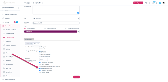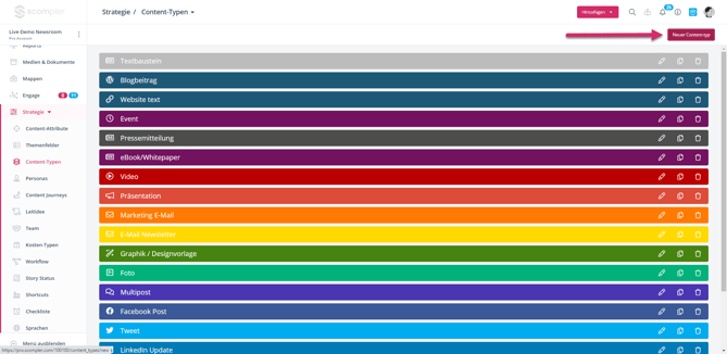 Dazu öffnen Sie im Bereich "Content-Typen" den gewünschten Beitragstyp oder legen einen neuen an:
