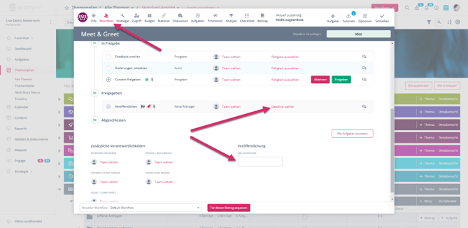Wenn Sie später einen Beitrag dieses Typen anlegen, legen Sie über die Deadline im Workflow den Anfangszeitpunkt und über die zusätzliche Option unterhalb des Workflows das Ablaufdatum fest: