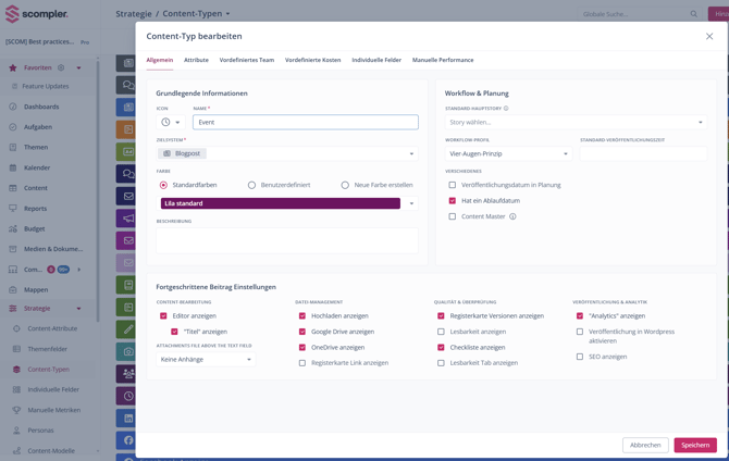 Beim Erstellen und Bearbeiten von Content-Typen haben Sie neben den üblichen Einstellungen mehrere Tabs zur Verfügung, die Ihnen helfen, Content-Typen noch stärker an Ihre Bedürfnisse anzupassen.