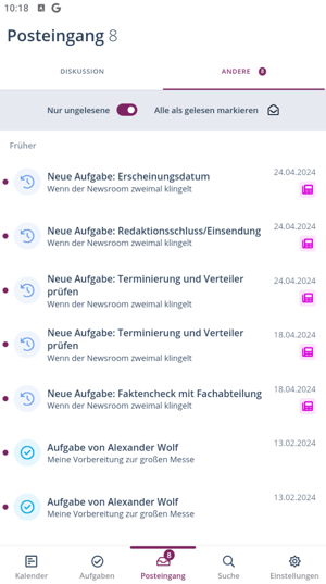Im Posteingang finden Sie eine Übersicht der Diskussionen in den Beitrags-, Story- oder Themenkarten, an denen Sie teilnehmen (Tab „Diskussion“), Benachrichtigungen zu Ihren Aufgaben und Erwähnungen (Tab „Andere“). Sie können direkt in der App an Diskussionen teilnehmen. Über die Schaltfläche „nur ungelesene“ blenden Sie schon gelesene Benachrichtigungen aus. Auch die tägliche Aufgabenzusammenfassung finden Sie im Posteingang. Ein Klick auf die einzelnen Aufgaben-Benachrichtigungen bringt Sie zur jeweiligen Aufgabenkarte.