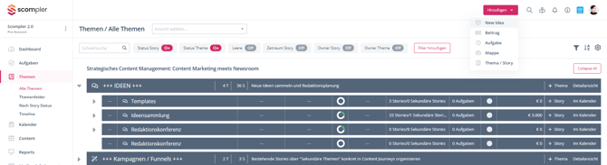 Legen Sie eine neue Idee direkt als Story an und sammeln Sie sie in einem Thema, um später einfach darauf zuzugreifen