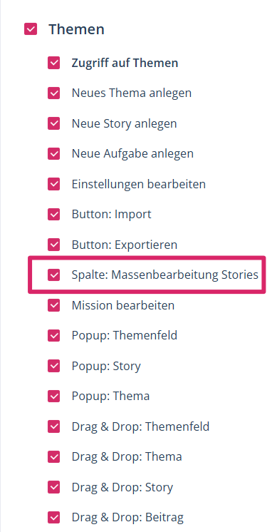 Hinweis: Um die Massenbearbeitungsfunktion nutzen zu können, muss diese zuerst für die betreffenden Nutzergruppen freigeschaltet werden. Klicken Sie hierfür in den Projekteinstellungen auf die jeweilige Nutzergruppe und aktivieren Sie den Punkt „Spalte: Massenbearbeitung Stories“.