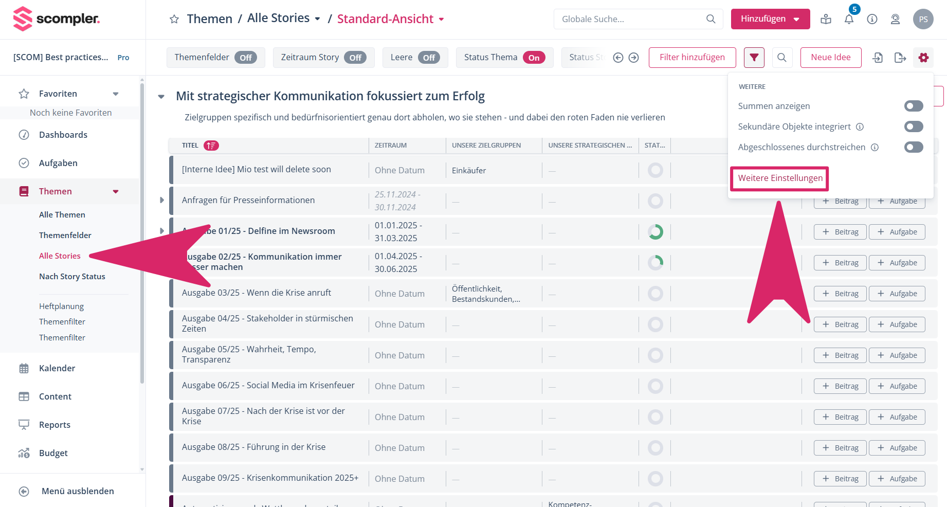 Haben Sie den Bearbeitungsknopf geklickt, erscheint ein weiteres Pop-up, in welchem Sie Status, Thema, sekundäre Themen, Shortcuts, Personas und Content-Modelle für die Stories wählen können und auch, ob bestehende sekundäre Themen erweitert oder überschrieben werden sollen.