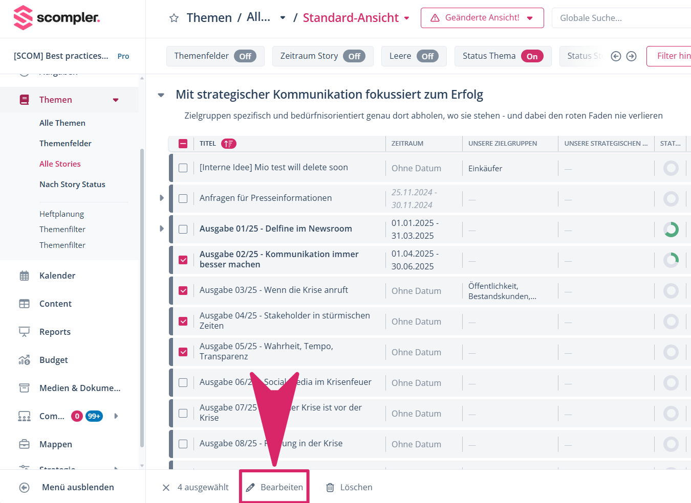 Nun können Sie mittels der Massenbearbeitungs-Checkboxen mehrere Stories auswählen und entweder löschen oder bearbeiten.