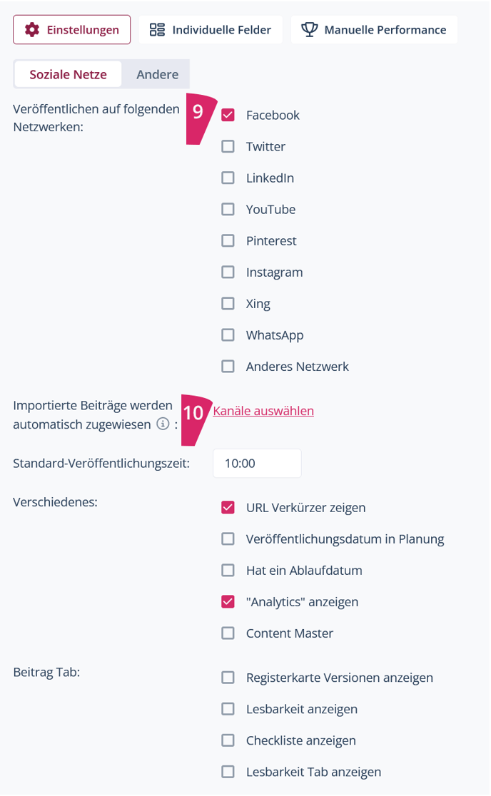 Der Tab „Manuelle Performance” erlaubt es Ihnen, Metriken mit Beiträgen von diesem Content-Typen zu verknüpfen. Diese erscheinen dann im „Analytik”-Tab der Beitragskarte. Erfahren Sie hier mehr.