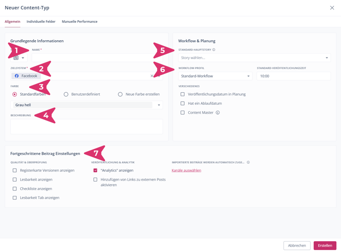 - Nur für PRO-Lizenz verfügbar - Entscheiden Sie, welcher Workflow am besten zu Ihrem Content-Typ passt. Die Aktivierung der Checkbox „Content Master“ stellt sicher, dass dieser Content-Typ immer an oberster Stelle in der Liste Ihrer späteren Beiträge zu einer Story angezeigt wird.