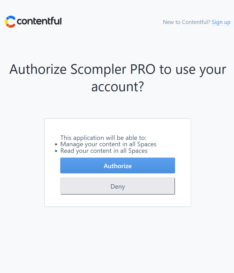 Here, you'll see an overview of the Spaces you have already connected. Click on “Login with Contentful” to add a new Space. During this setup, click on “Authorize” to grant Scompler to access your Spaces. Your Contentful account is now linked to Scompler.