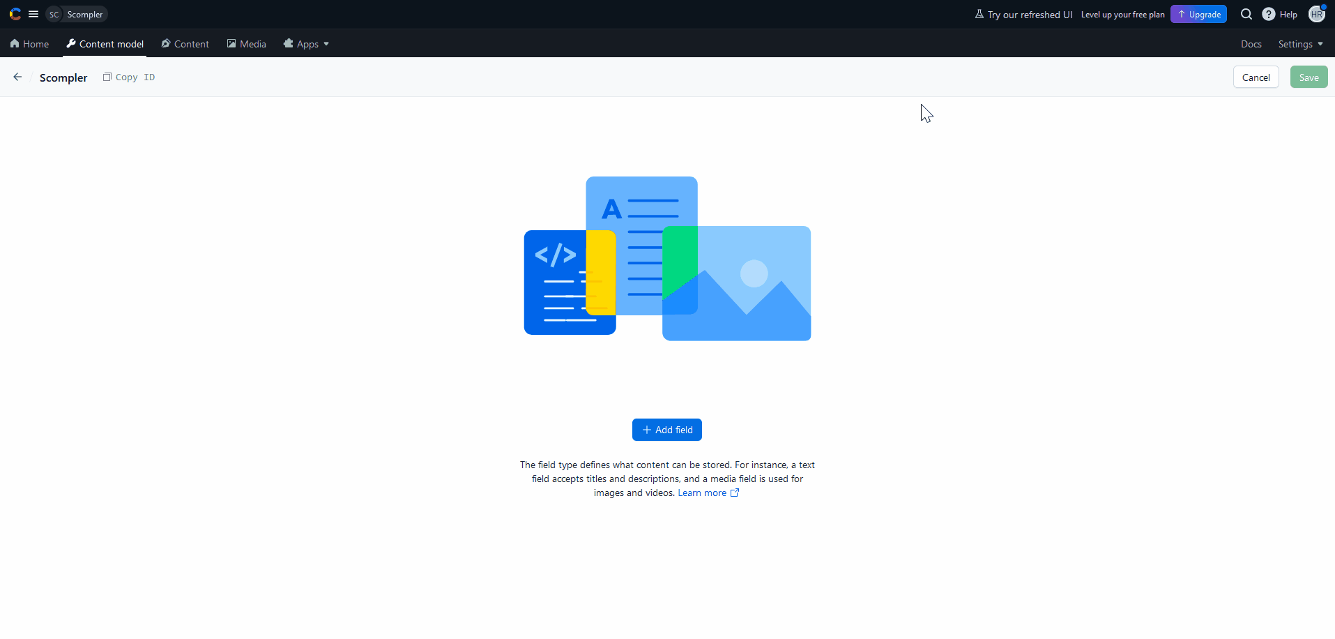 To display content in an article in Scompler, go to the “Content Model” area in Contentful, select your content model and create the necessary fields: