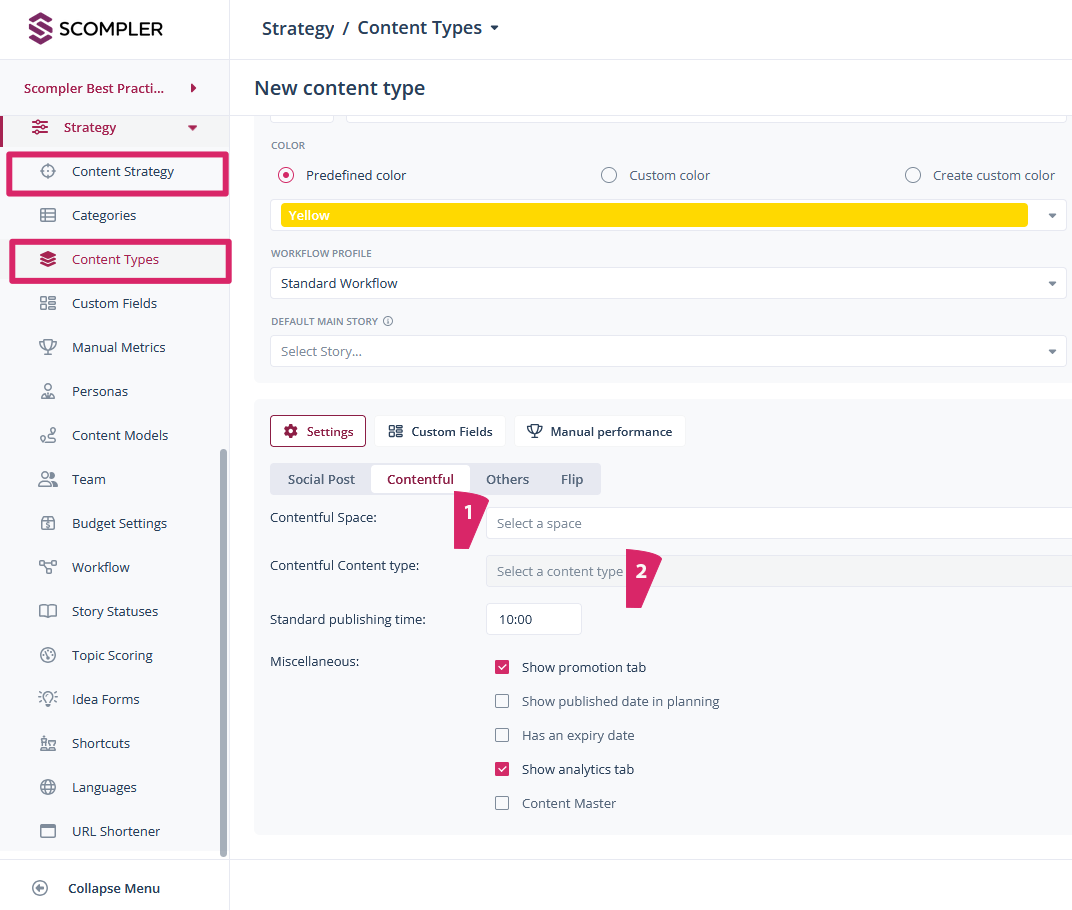 Go to the “Contentful” tab and select the Contentful Space (1) and the content type (2) within Contentful.