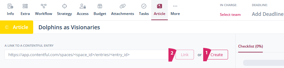 Now you have two options for linking your entry in Contentful to the article. In the “Article” tab of the article card, click on “Create” (1) to create a new entry in Contentful. An individual link will be created. If, on the other hand, you enter a predefined link for the entry in Contentful in the field (2) and click on “Connect”, this entry will be linked to the article.