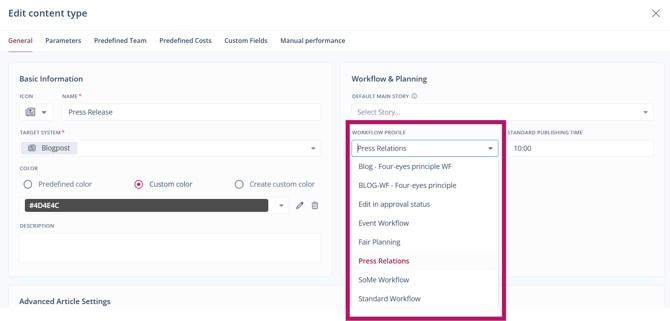 Tip: Define responsible team members or teams for content types to automatically pre-fill the roles in the workflow when creating articles.