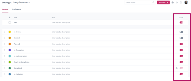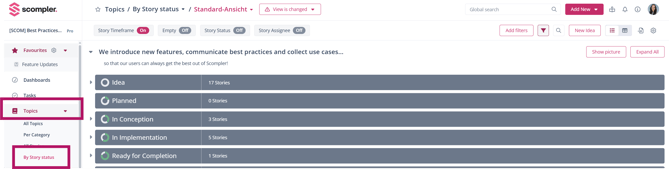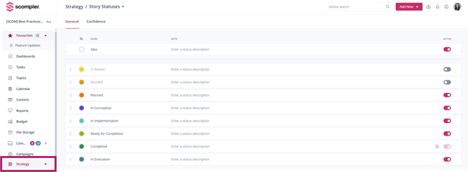 As a Scompler PRO customer, you can modify the status phases of your stories to fit your requirements. You can rename specific phases or deactivate those that are not necessary for your workflow. To do this, navigate to the Story Status section in the left-hand menu under Strategy. Here, you will find a list of available story status phases.