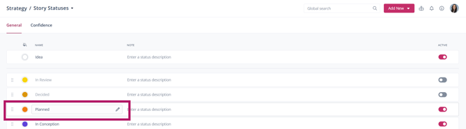 If you want to change the name of a status, hover your mouse over the status name, and a pencil icon will appear. You can click on it to edit the name. Additionally, in the Notes column, you can add comments related to the status name.