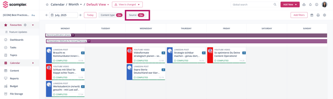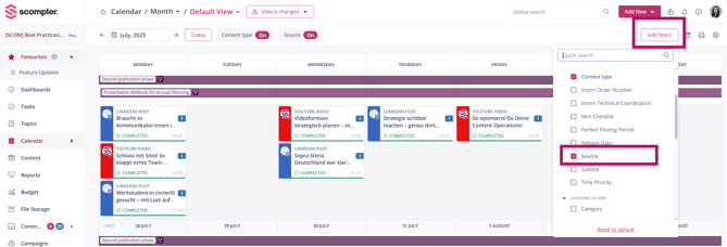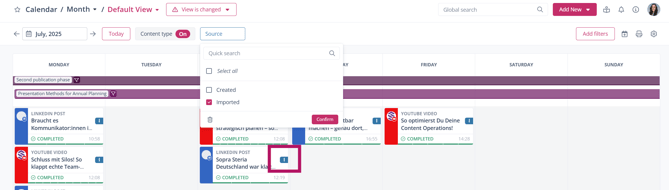 Using calendar filters, you can filter content and create a personalized view. If you only want to see imported posts, click “Add filter” and select “Source” from the drop-down menu to activate the filter in the top bar.