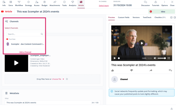 Create a new YouTube article. In the article tab, click “Select channels” to select your YouTube channel or channels to publish to:EN_04_Kanalauswahl