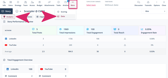 To access this data, open the relevant story or topic and click on the “Data” tab. Here you will find the "Analytics" subtab and below it the performance data of each channel on which content was published. (Blog articles, Facebook, X (Twitter), Instagram, LinkedIn, YouTube, etc.). Activate the option "Detailed View" to display the data of each channel.