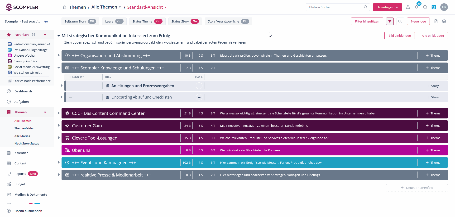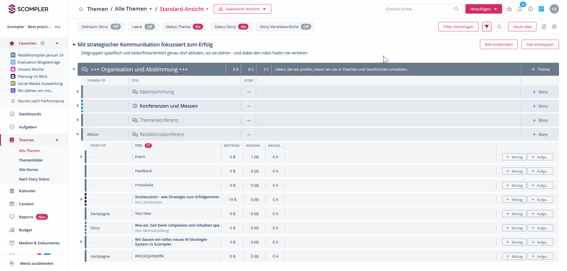 Spalten: Themenfelder, Themen, Stories und Beiträge