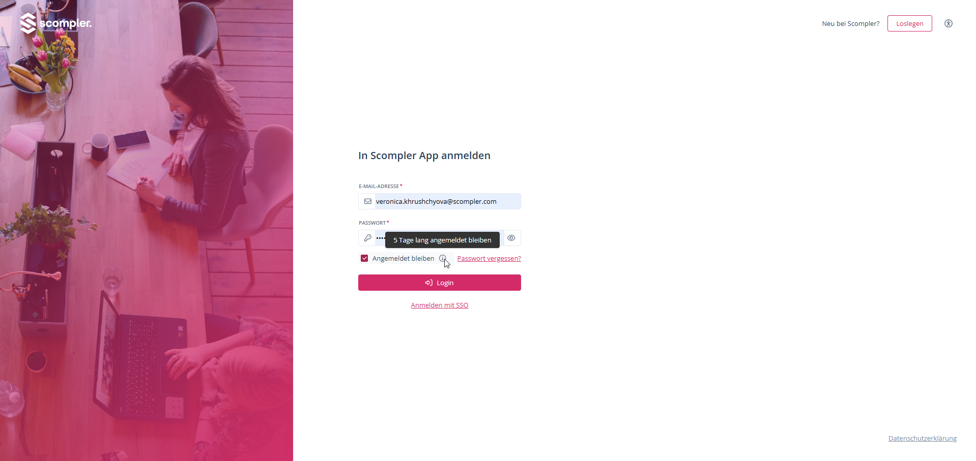 Auf privaten und sicheren Geräten ist dieses Vorgehen jedoch weitestgehend unbegründet, weshalb Scompler beim Login eine “Eingeloggt bleiben”-Funktion anbietet: Klicken Sie einfach die betreffende Checkbox an, und Ihre Sitzung wird für fünf Tage aktiv gehalten, sollten Sie sich nicht vorher manuell ausloggen oder Ihre Browser-Cookies löschen.