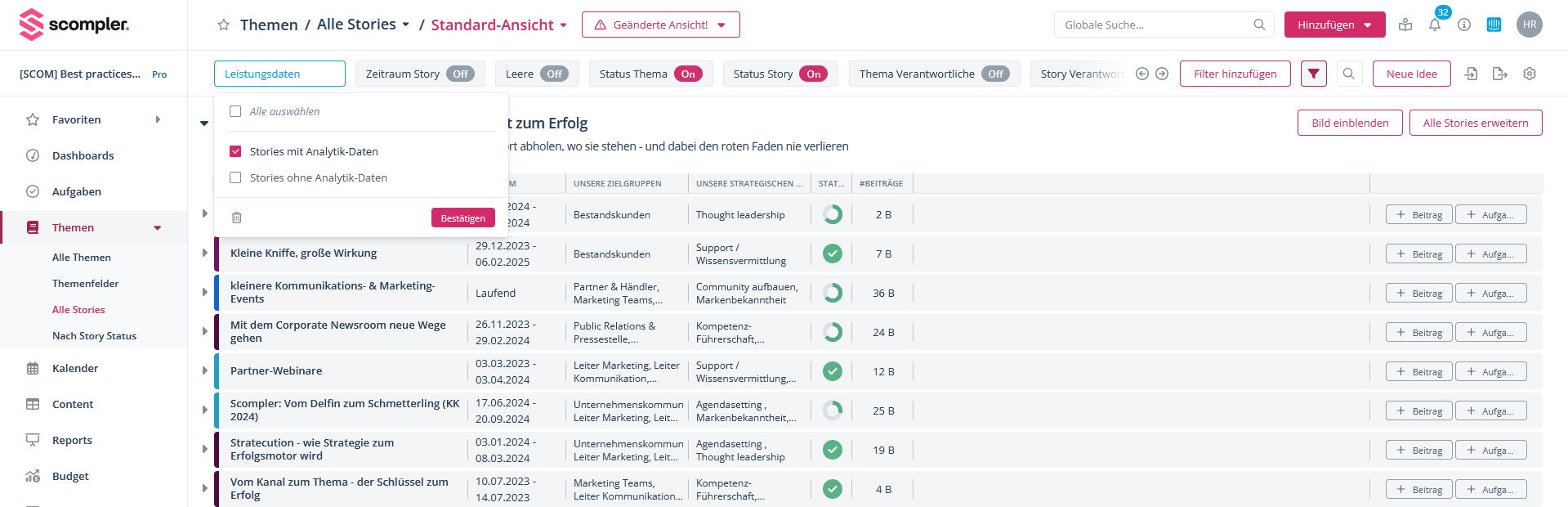 TIPP: Verwenden Sie den Filter „Leistungsdaten“, um nur Stories ohne oder mit Analytik-Daten anzuzeigen.