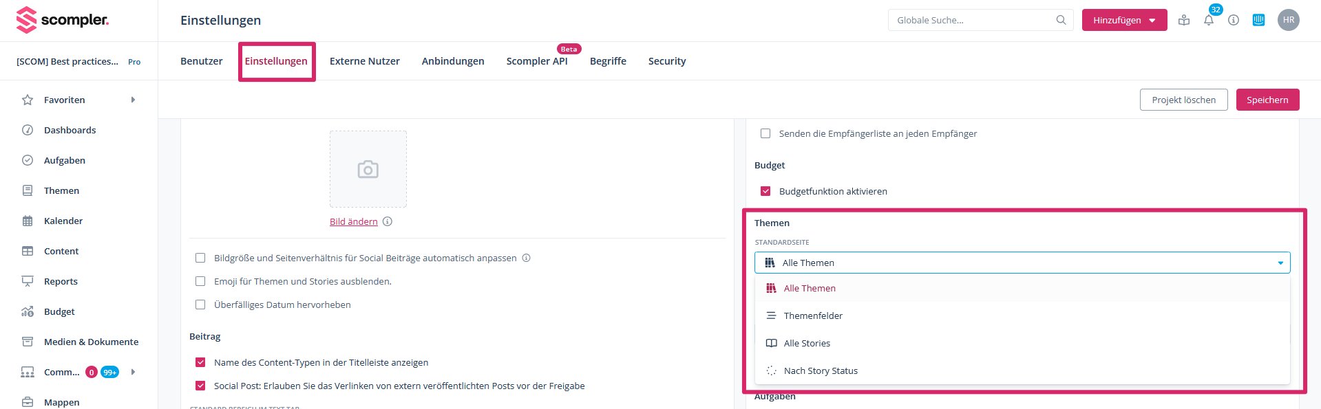 In den Projekteinstellungen im Tab „Einstellungen“ können Sie im Bereich Themen die Standardseite für die Themenansicht einstellen: