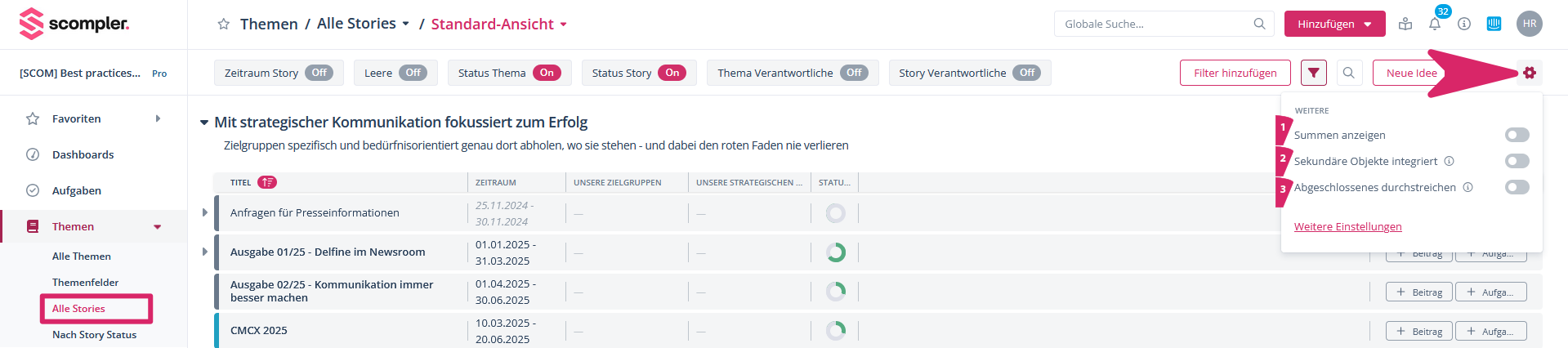 Mit dem Konfigurationsrad oben rechts können Sie die Anzahl der Stories anzeigen (1), sekundär verknüpfte Stories inkludieren (2) und abgeschlossene Stories als durchgestrichen (3) erscheinen lassen.