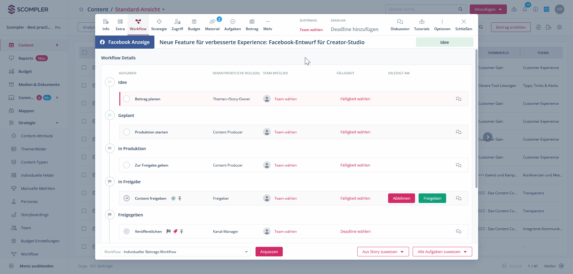In der Scompler PRO-Version können Sie auch die einzelnen Arbeitsschritte im Workflow auf Beitragsebene anpassen. Wechseln Sie dazu über den Button „Anpassen“ in den Bearbeitungsmodus.