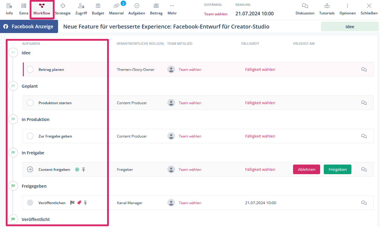 Haken Sie die einzelnen Arbeitsschritte nacheinander ab, indem Sie im Workflow-Tab der Beitragskarte die Checkbox links in der Aufgaben-Zeile anklicken, um in die jeweils nächste Status-Phase zu wechseln:
