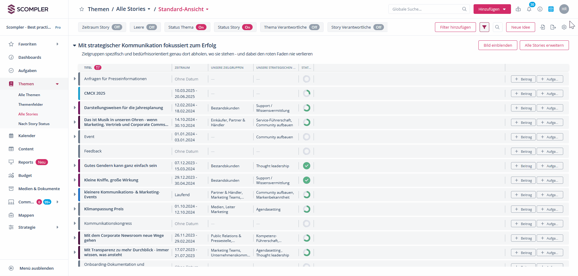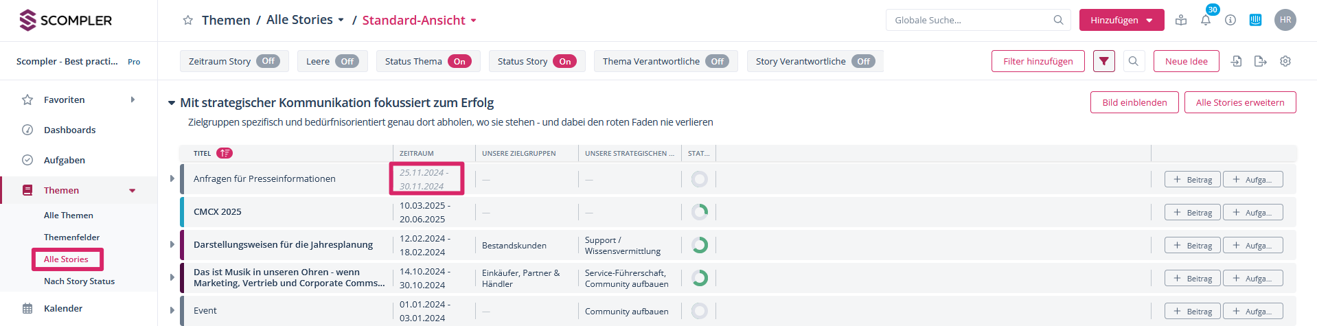 Innerhalb eines angezeigten Zeitraumes können Sie die Stories nach verschiedenen Kriterien sortieren. Klicken Sie dazu die Spaltenköpfe an, um die Stories zum Beispiel nach Thema, Zeitraum oder nach Status zu sortieren:
