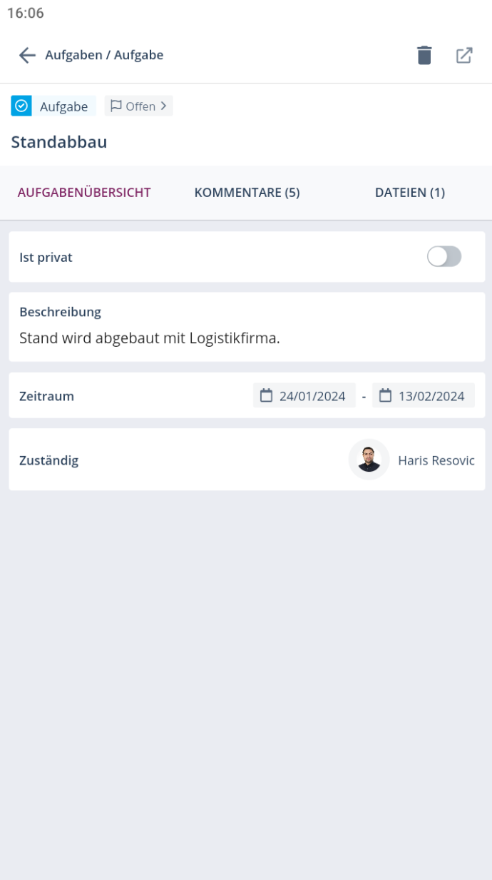 Mit Klick auf eine Aufgabe wird die Aufgabenkarte geöffnet. Hier wird Ihre Aufgabe gezeigt inklusive Titel, Beschreibung, Deadline, dazugehörige Ressourcen (Themen, Stories, Beiträge) und zuständigen Personen oder Teams. Ebenfalls steht Ihnen der Schalter „Ist privat“ zur Verfügung, der bei Aktivierung die Aufgabe nur Ihnen anzeigt. Um die Fälligkeit der Aufgabe zu ändern, navigieren Sie neben „Zeitraum" auf das Datum und wählen Sie im Kalender ein neues Datum. Unter „Zuständig“ können Sie die zugewiesenen Personen ändern.