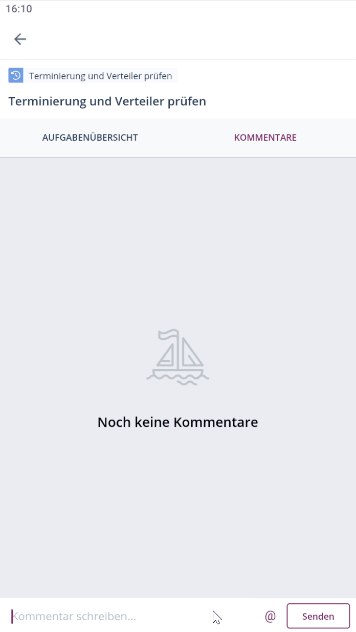 Ihnen steht ebenso die Kommentarfunktion für die geöffnete Aufgabe im Reiter „Kommentare“ zur Verfügung. Auch Erwähnungen sind mit Klick auf das @-Symbol oder über Eingabe der Handytastatur möglich. Sie können per „Daumen hoch” auf Nachrichten reagieren, indem sie doppelt auf den entsprechenden Kommentar tippen. Eigene Kommentare können Sie wieder löschen, indem Sie vom Kommentar nach links langsam wischen. Auch externe Links lassen sich öffnen. Diese werden im Normalfall mit der eingestellten Standard-App geöffnet.