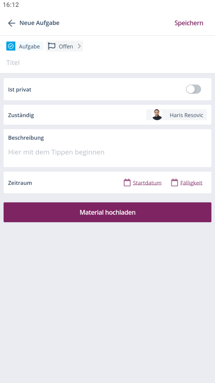 Um eine neue Aufgabe aufzusetzen, navigieren Sie einfach auf das große Plus im Aufgabenbereich der Scompler Mobile App. Hier geben Sie der Aufgabe einen Titel, fügen eine Beschreibung hinzu, legen die Zuständigkeit und den Zeitraum fest und laden Material hoch. Ebenso besteht hier die Möglichkeit, die Aufgabe als privat zu setzen.
