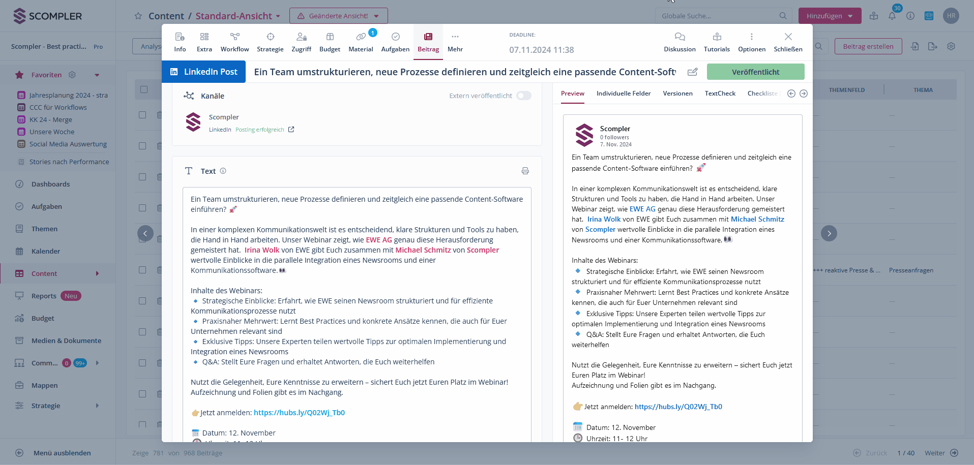 HINWEIS: Alle Änderungen innerhalb eines bereits veröffentlichten Beitrags sind nur im Scompler-Beitrag wirksam und nicht seiner veröffentlichten Version in den Netzwerken.