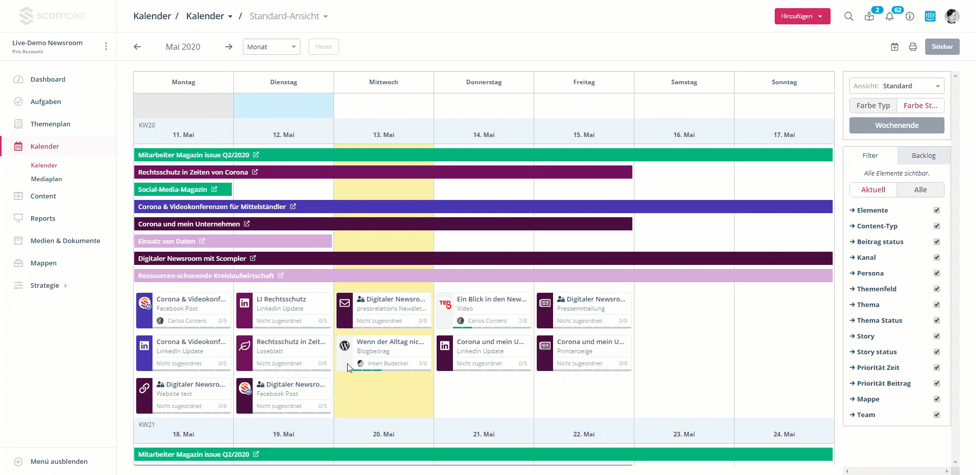 Manchmal hat man Beiträge oder Aufgaben erstellt, die noch keiner Story zugeordnet sind, oder nicht optimal zugeordnet wurden. Dies lässt sich in der Kalender-Ansicht nicht nur leicht erkennen, sondern auch direkt beheben. Wie das funktioniert, sehen Sie in unserem kurzen Video, oder weiter unten in der Beschreibung: