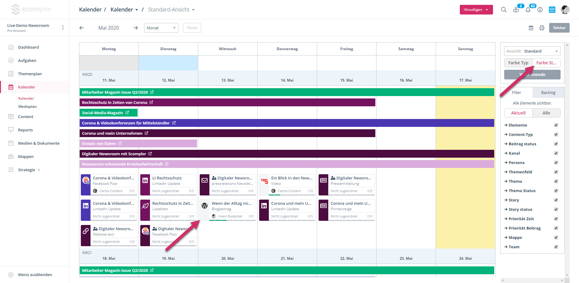 Sie können sich Ihre Beiträge in der Kalender-Ansicht in der Farbe der Content-Typen, oder der zugeordneten Story anzeigen lassen. Dafür wählen Sie rechts in der Sidebar die gewünschte Option: