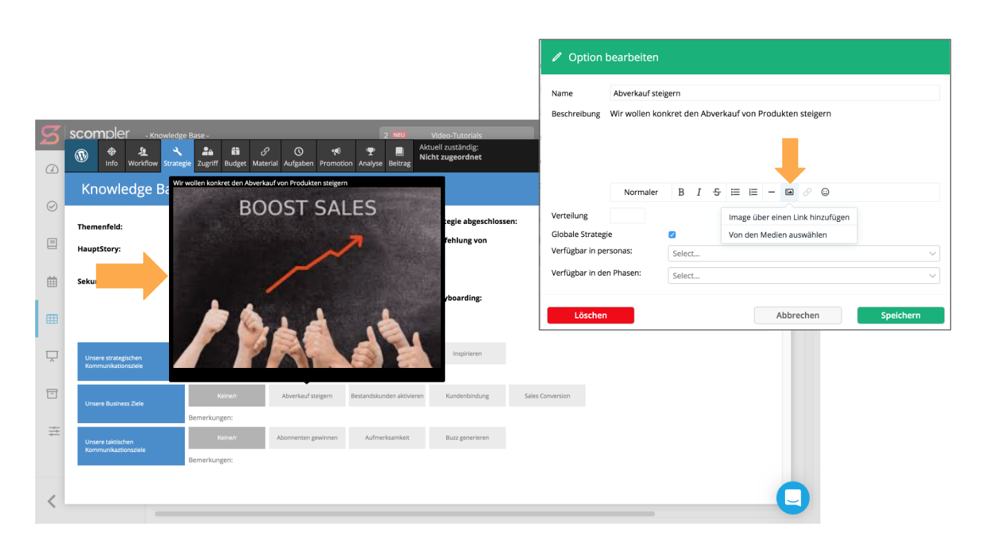 In vielen Bereichen, wie z.B. Themen, Stories oder auch Strategie-Optionen, ist es nun möglich, ein Bild zu der Beschreibung hinzuzufügen. Dieses wird anschließend in der Übersicht als Tooltip angezeigt, wenn Sie die Maus über das entsprechende Thema, die Story oder Strategie-Option bewegen.