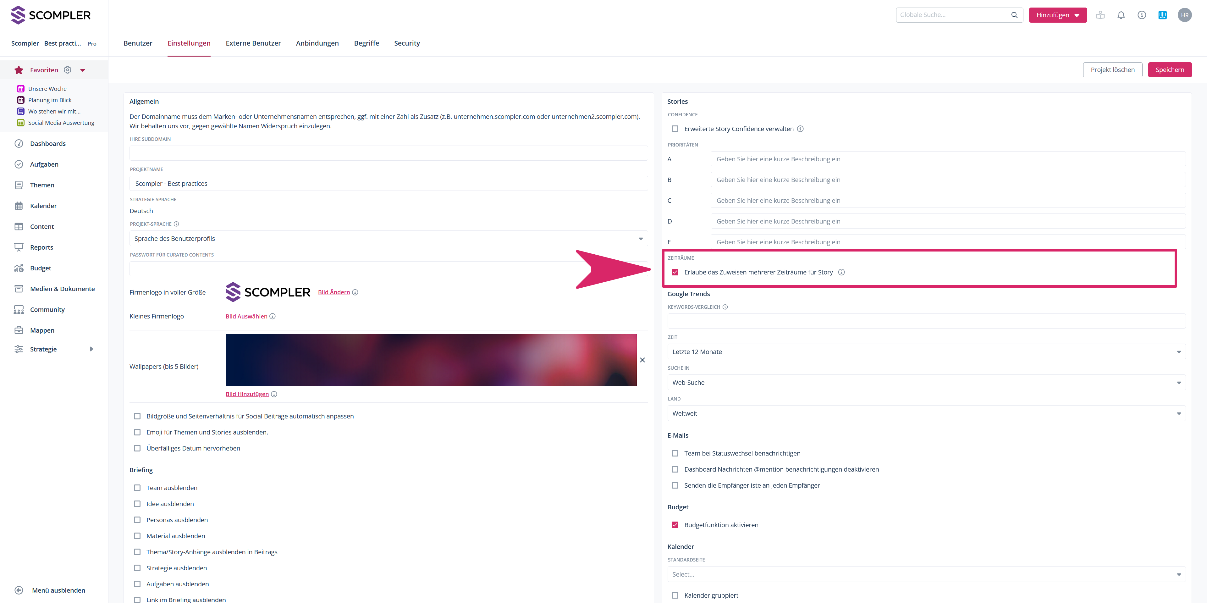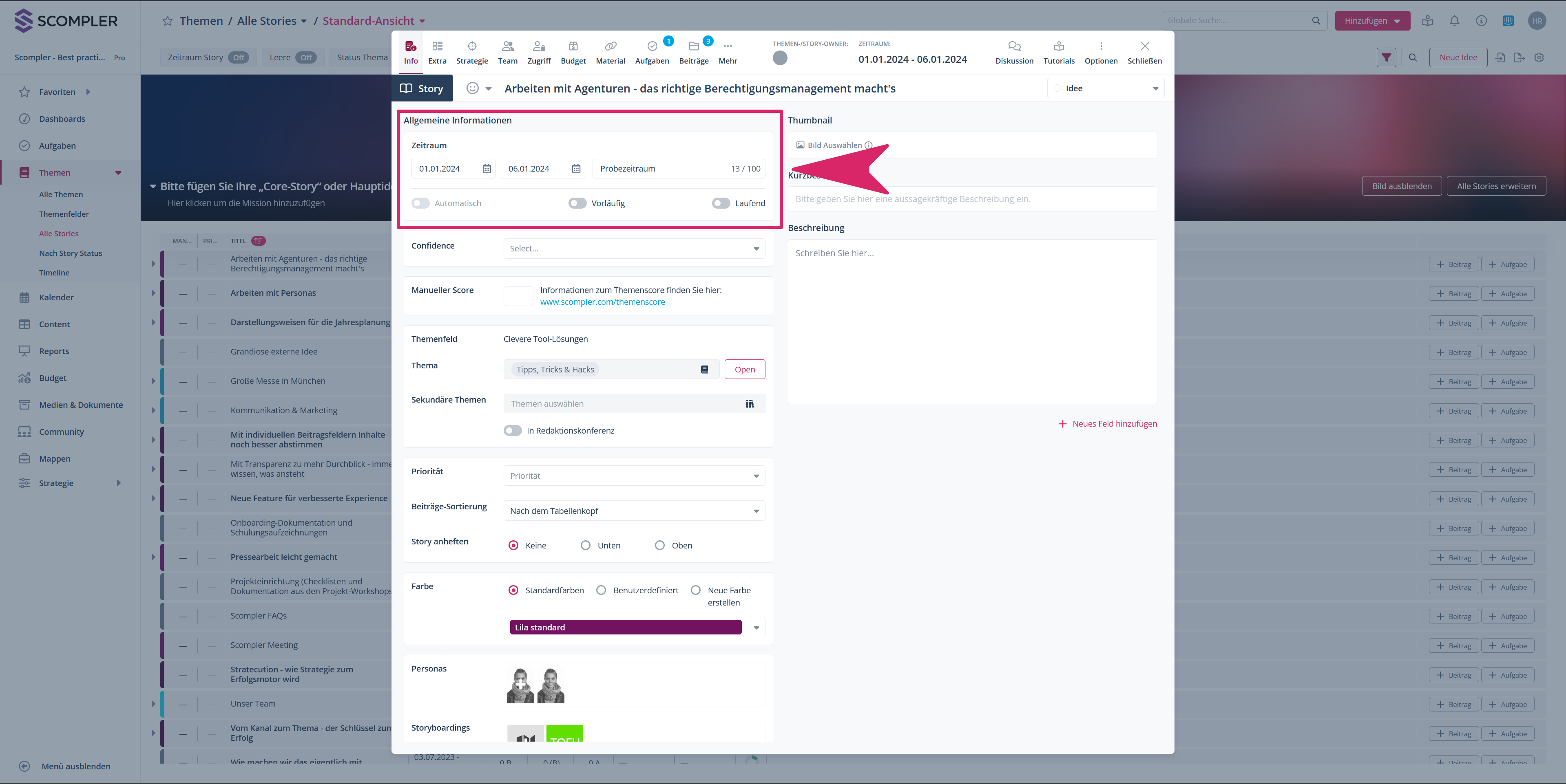 Aktivieren Sie die Checkbox „Datum automatisch setzen“, indem Sie auf das Kästchen klicken. Die Story wird vom frühesten bis zum spätesten Deadline-Datum der zugehörigen Beiträge in der Story-Karte angezeigt. Der Zeitraum wird automatisch aktualisiert, sobald sich Deadlines der zugehörigen Beiträge ändern, Beiträge gelöscht werden oder neue Beiträge hinzukommen.
