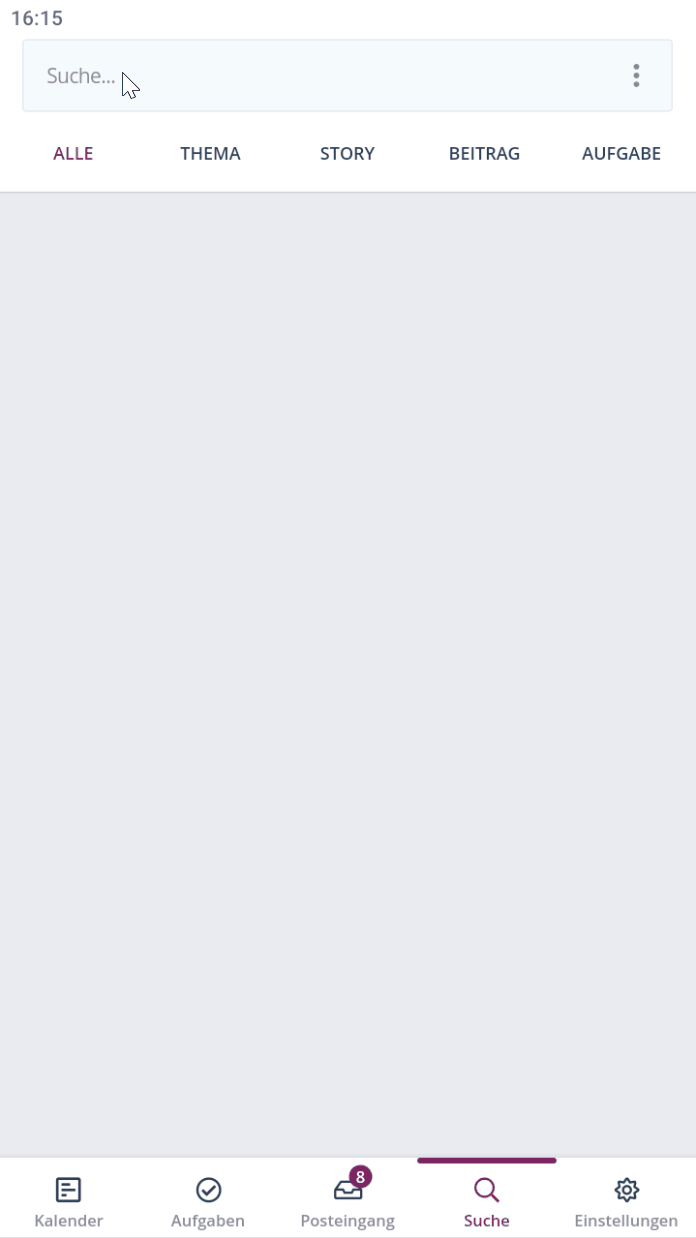 Geben Sie einfach den gewünschten Begriff ein und bestätigen Sie die Eingabe mit Ihrer Smartphone-Tastatur. Standardmäßig sehen Sie alle Elemente, die Ihren Begriff beinhalten. Sie können durch Tippen auf den dazugehörigen Tab nach Thema, Story, Beitrag und Aufgabe filtern.
