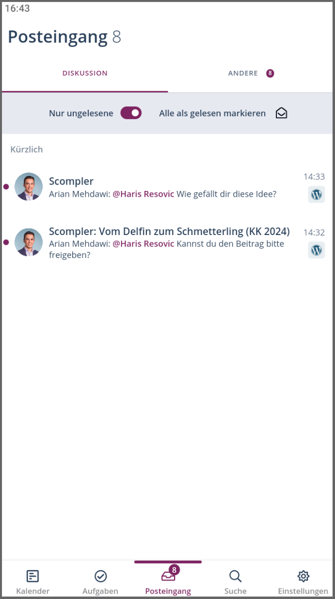 Der Posteingang innerhalb der Scompler Mobile App ist unterteilt in die Tab „Diskussion“ und „Andere“.