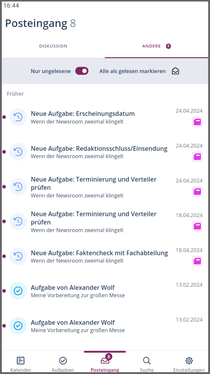 „Diskussion“ enthält alle Nachrichten aus Diskussionen in Beitrags-, Story-, Themen- oder Aufgabenkarten, denen Sie folgen. Hier können Sie mit dem Schalter „Nur ungelesene“ sich nur noch nicht bereits gelesene Nachrichten anzeigen lassen. Mit einem Klick auf „Alle als gelesen markieren“ markieren Sie alle Nachrichten als gelesen. Wischen Sie nach unten, um die Karte zu aktualisieren. Wischen Sie eine ungelesene Benachrichtigung langsam nach links oder rechts, dann erhalten Sie weitere Interaktionsmöglichkeiten.