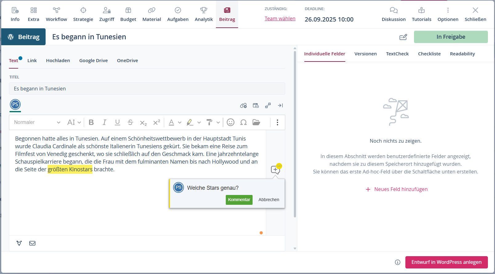 Von nun an ist es möglich, Beiträge auch im Status „In Freigabe“ direkt im Text zu kommentieren. So können alle Beteiligten Inhalte kontextbezogen kommentieren – dort, wo Feedback am wichtigsten ist, ohne ungewollte Änderungen am Text.