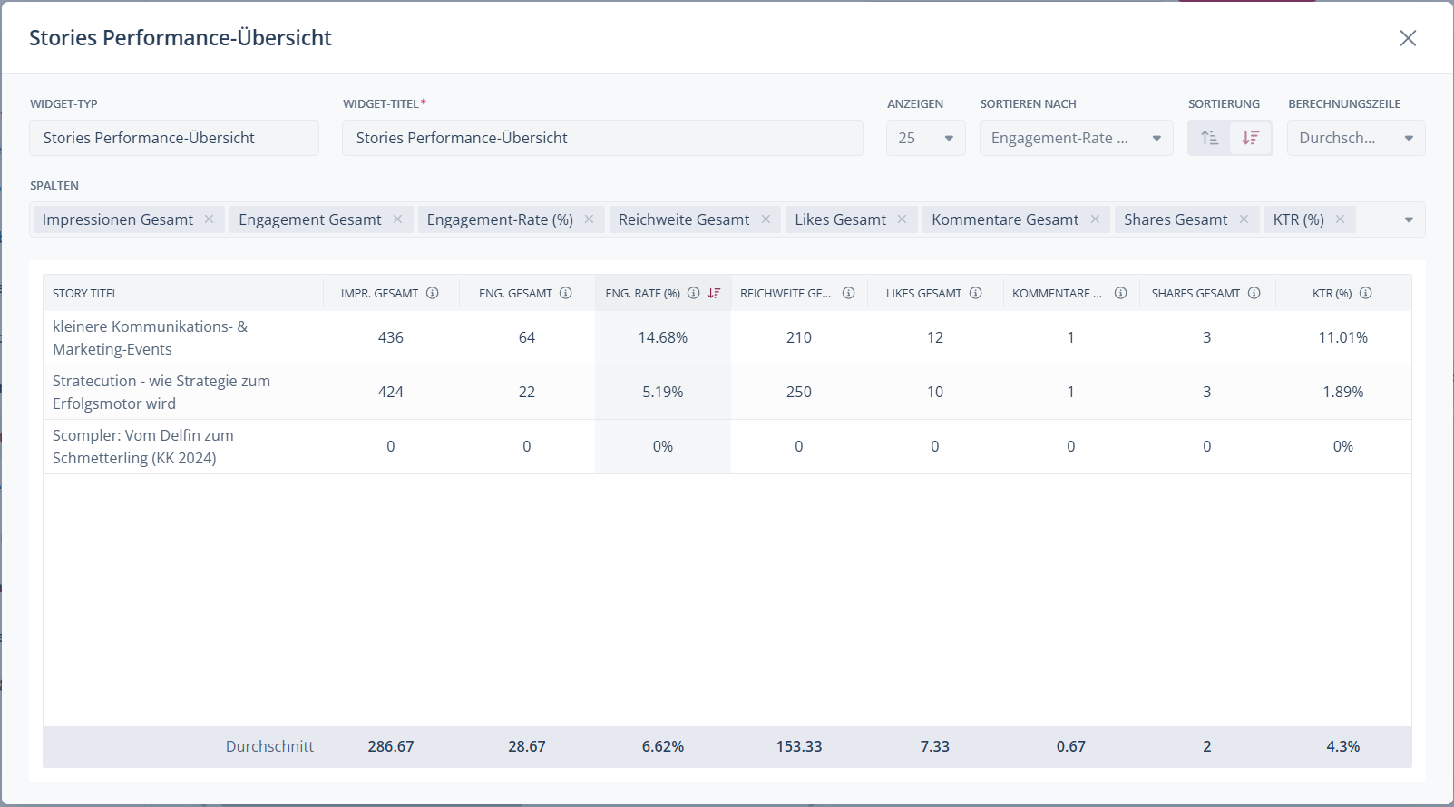 Die Performance-Widgets im Reports-Bereich haben einige Verbesserungen erfahren: Wir haben detaillierte Engagement-Metriken wie Likes, Kommentare, Shares, Klicks und CTR neben den Gesamtwerten zu den Widgets „Stories Performance-Übersicht“ und „Themen Performance-Übersicht“ hinzugefügt. Darüber hinaus werden nun auch LinkedIn-Reichweite und die TikTok-Favoriten importiert.