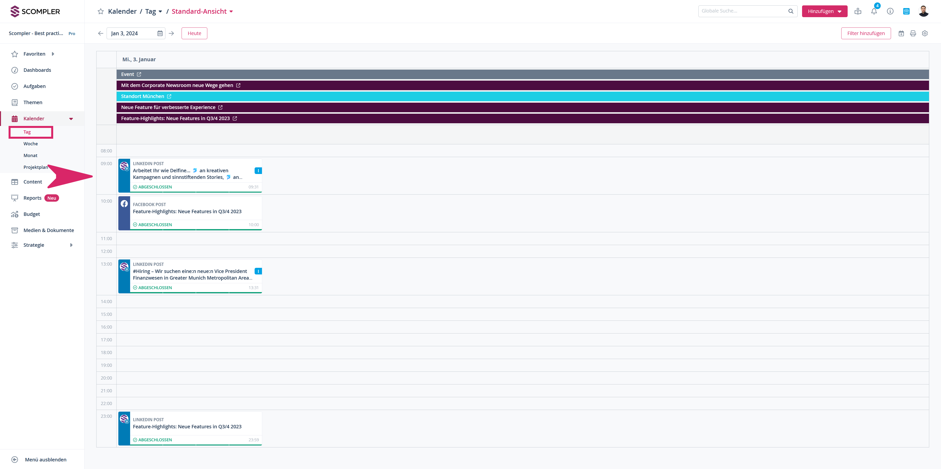 In der Scompler Kalenderansicht können Sie nicht nur einfach einen Überblick Ihrer Aktivitäten erhalten und Beiträge direkt hinzufügen. Der hoch performante Kalender bietet vielfältige Optionen, um genau das zu sehen, was Sie grade benötigen. So können Sie sich durch die geschickte Kombination aus Filtern und Ansichten Ihr perfektes Planungstool erstellen. Auch Stories können Sie in allen Kalenderansichten mit verschiedenen Laufzeiten und Phasen anzeigen.