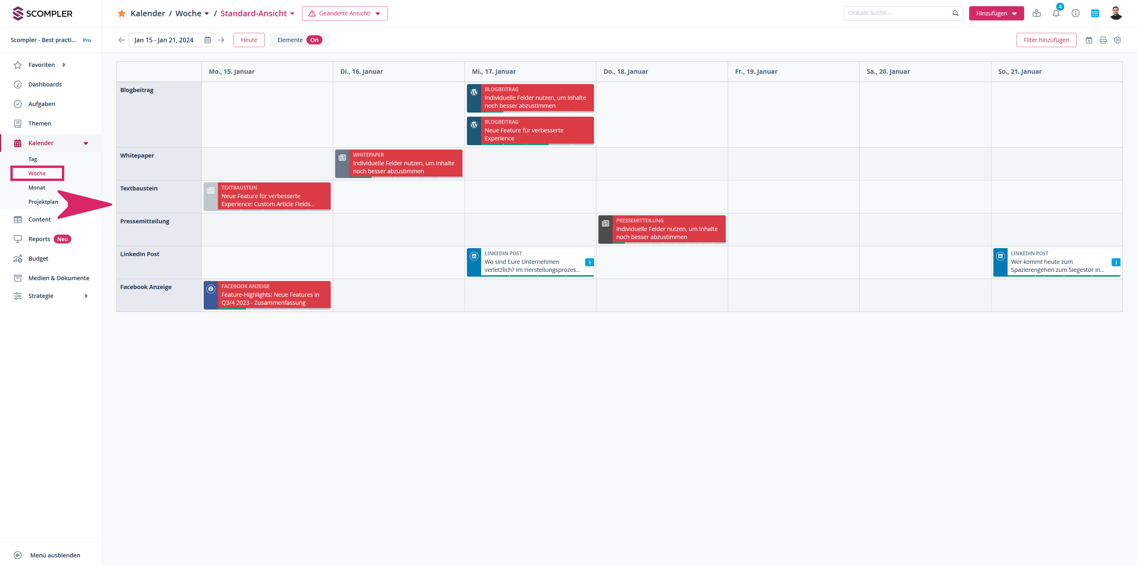 Wenn Sie den Zeitraum der Ansicht erweitern möchten, wechseln Sie zur Wochenansicht. Hier können Sie die Wochentage ab acht Uhr sehen. Wenn ein Beitrag vor dieser Zeit geplant ist, wird die Zone ab fünf Uhr angezeigt.