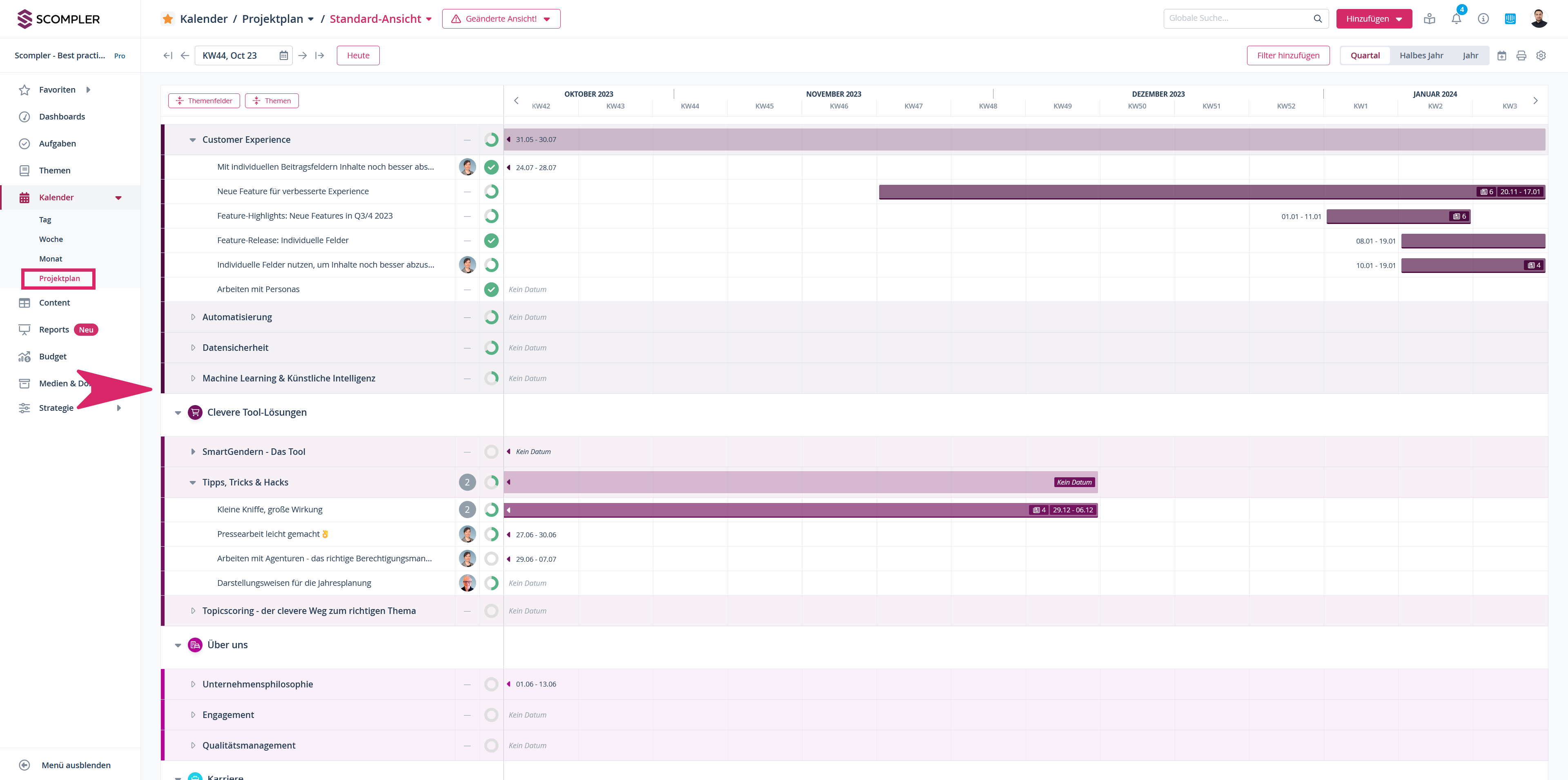 Diese Ansicht gibt Ihnen einen perfekten Überblick über den chronologischen Verlauf Ihrer Kommunikationsplanung in jedem Quartal, einem halben – oder dem ganzen Jahr. Dies ermöglicht Ihnen wiederum die Visualisierung u. a. des Aktivitätsablaufplans, des Projektstrukturplans, des Ressourcenplans usw.