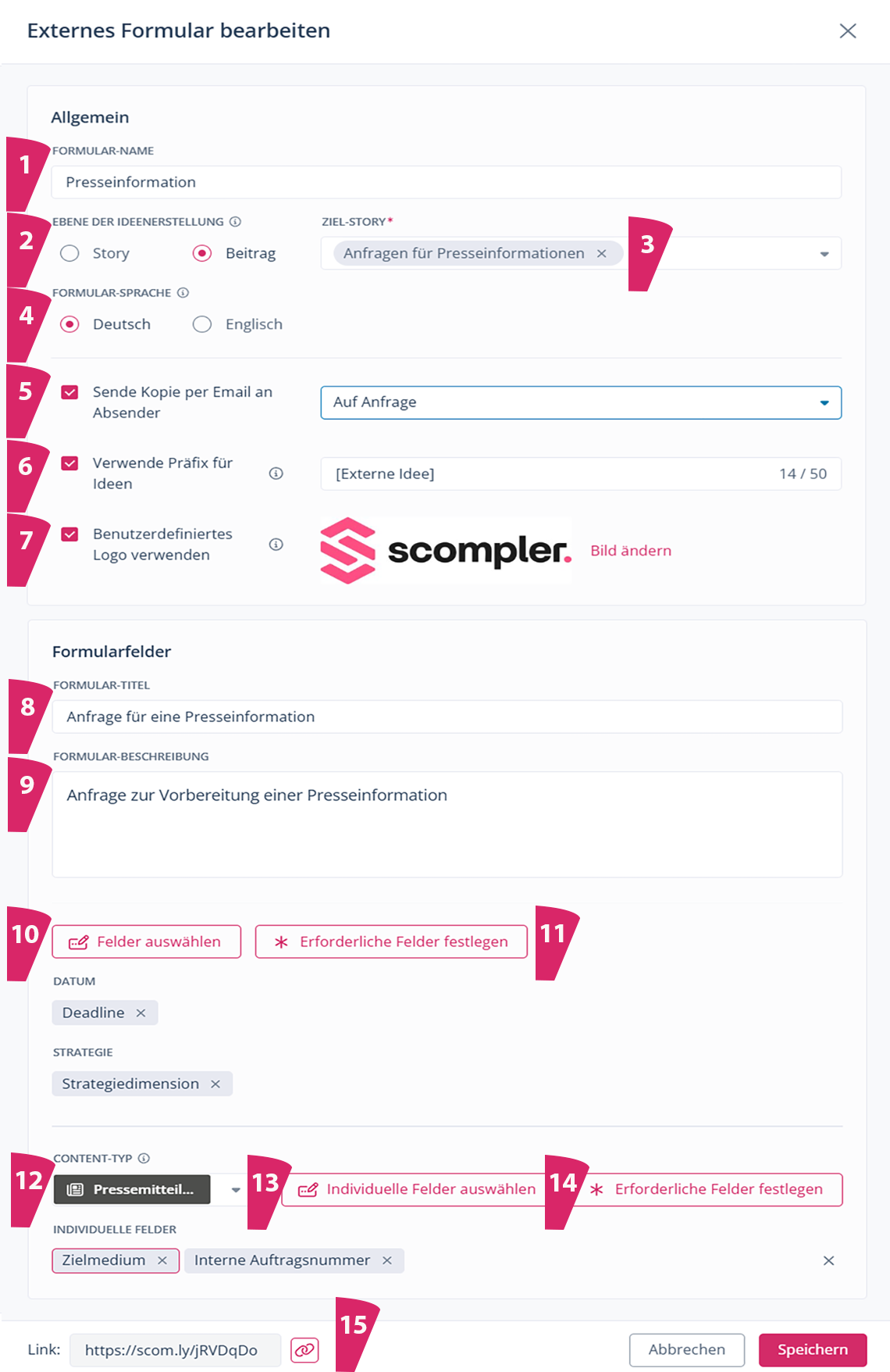 - Unter (15) finden Sie den Link zum Formular, den Sie mit Ihren externen Kolleg:innen oder Kunden teilen können.