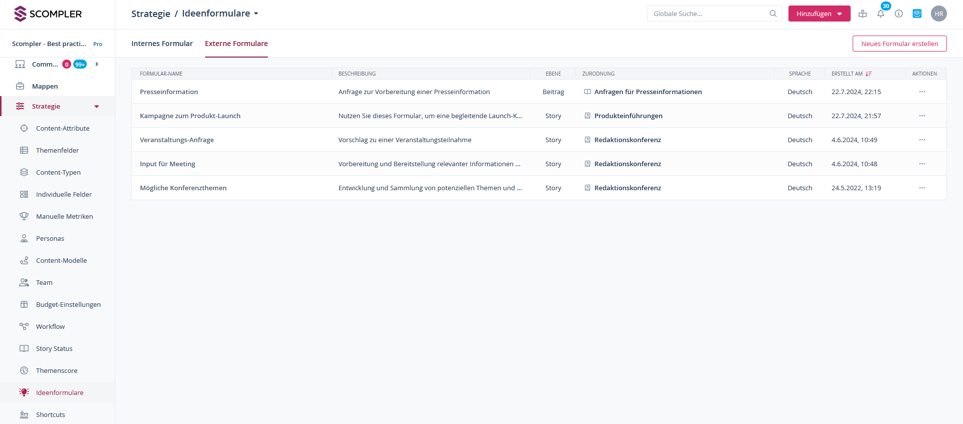 In der täglichen Arbeit kommt es häufig vor, dass Nutzer:innen neue Ideen oder Vorschläge für Ihre Kommunikationsaktivitäten einreichen möchten, die anschließend von Ihrem Team in Scompler bewertet werden. In Scompler geschieht dies über die Formulare. Interne Formulare erlauben es Ihren Nutzer:innen, Ideen per Klick auf den Button „Hinzufügen“ > „Neue Idee“ einzureichen. Nutzer:innen ohne Scompler-Zugang können Sie über einen Link Zugriff auf die eingerichteten Ideenformulare gewähren.