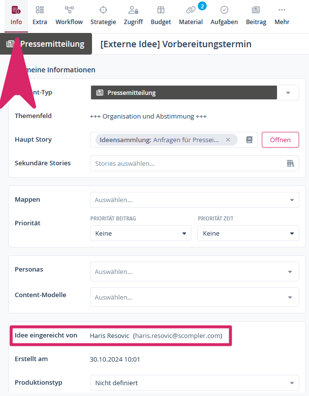 Im Info-Tab in der Beitragskarte der eingereichten externen Idee können Sie jederzeit einsehen, wer die Idee eingereicht hat und die Person anhand seiner/ihrer Mail-Adresse kontaktieren: