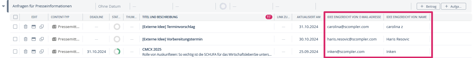 In den Einstellungen der Themen- und Content-Ansicht können Sie unter „Spalten Stories“ und „Spalten Beiträge“ in der Kategorie „Eigenschaften“ zwei weitere Spalten hinzufügen, die den Namen und die Mail-Adresse des Einreichenden zeigen: