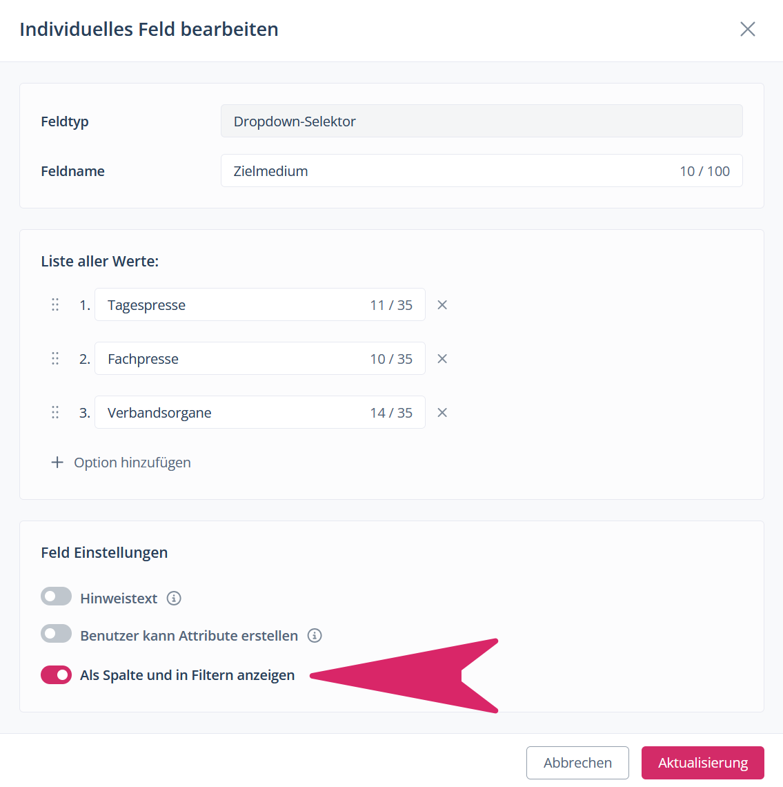 Die Inhalte der individuellen Felder sind ebenfalls als Filter im Kalender verfügbar und können in den Ansichten im Themen- und Content-Bereich als Spalten angezeigt werden. Um Ihre individuellen Felder in den Filtern verfügbar zu machen, muss für das entsprechende Feld die Option „Als Spalte und in Filtern anzeigen“ aktiviert sein: